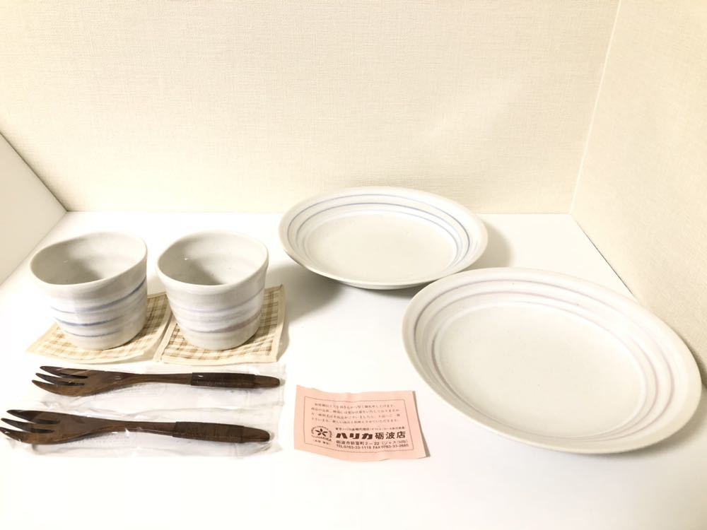 > ハリカ 陶製 木製 【桜と空パスタランチペア】 パスタプレート& カップ&フォーク&コースター2組セット 未使用 美品 箱付属M
