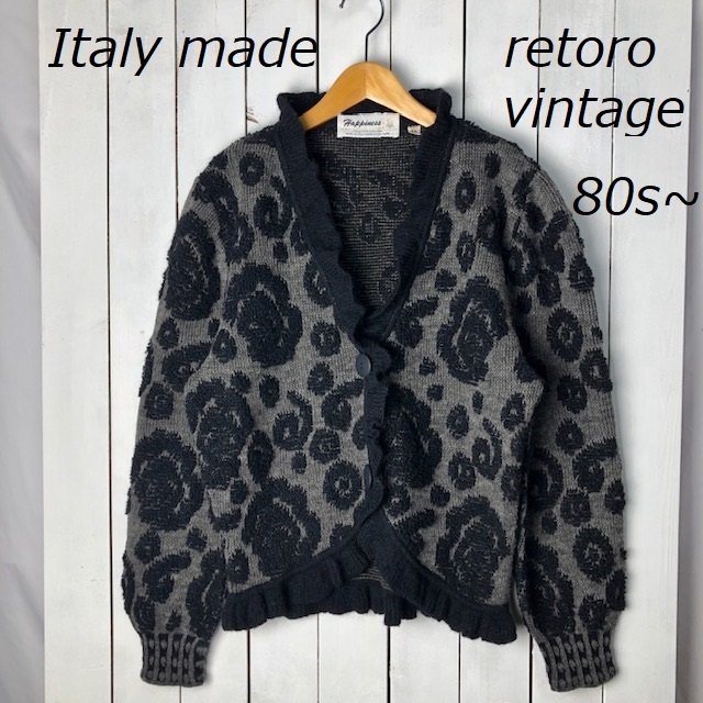 > レトロ古着 80s~ イタリア製 総柄 フリルニットカーディガン 44 黒×グレー オールド ヴィンテージ モダン ざっくり ミドルゲージ ●131