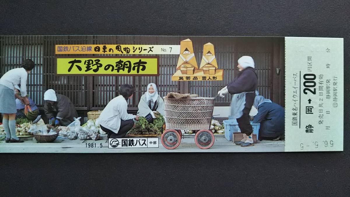 - 0116-42【国鉄記念きっぷ】国鉄バス沿線四季の風物シリーズ7 大野の朝市 国鉄東名ハイウェイバス 静岡駅 ナンバリング「0007」昭和56年