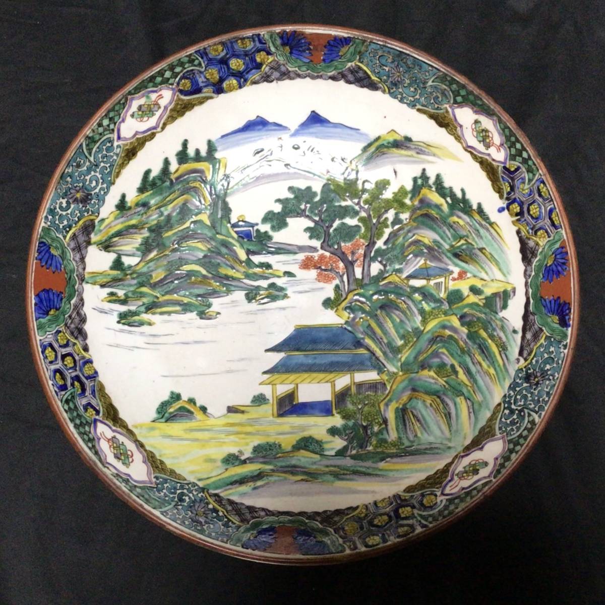 - 旧家よりの蔵出し 古九谷 青手色絵山水大皿 417mm 時代物 幕末~明治 ☆ 飾り皿 骨董 古美術 古玩