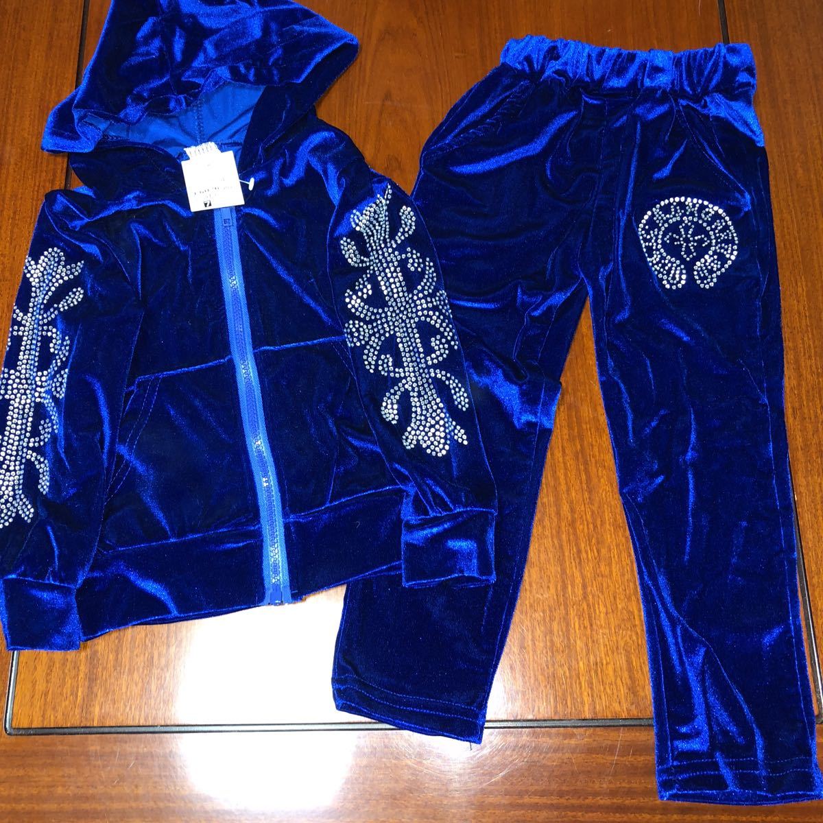 > 男の子用 セットアップ 上下セット ジャージ 90~100㎝位 ダンス衣装 兄弟でも 青 ベロア生地 ラインストーン スタッズ 新品