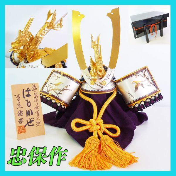 - 忠保作 御兜飾 甲冑 長鍬形兜 特製 はるかぜ 梅に鶯柄白金金具 五月人形 20号 豪華絢爛 金彩 大越 飾台 端午の節句 知性人徳勇気 お買得⑩