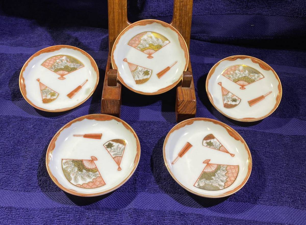 - 九谷焼き 永楽作 金彩赤絵 扇面の図 小皿 5客 智