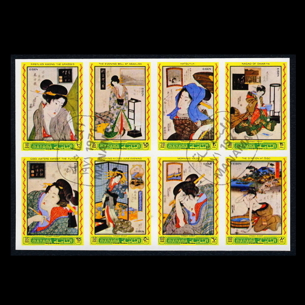 - ■マナーマ(アラブ首長国)切手 浮世絵 / 渓斎英泉 8種シート 初日印 無目打