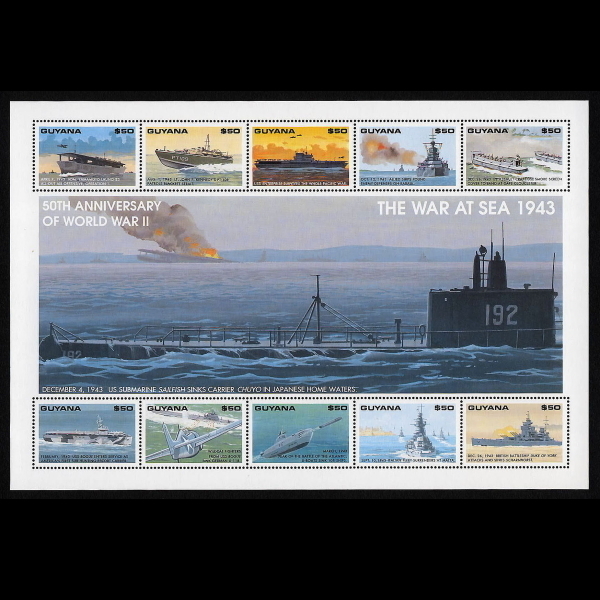 - ■ガイアナ切手 第二次世界大戦 50周年 / USSエンタープライズ他 10種シート