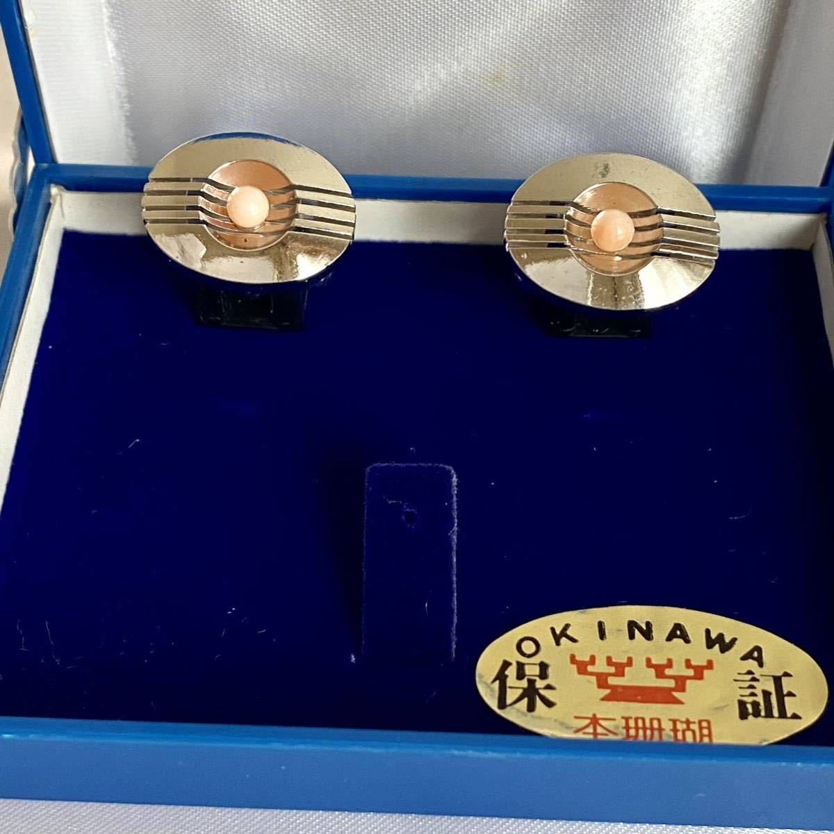 > 未使用 本珊瑚 カフスボタン シルバーカラー カフス カフリンクス メンズ アクセサリー OKINAWA 沖縄 サンゴ 本珊瑚保証 ケース付