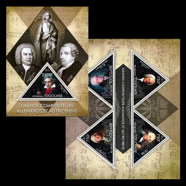 - ■トーゴ切手 2013年 偉大な音楽家 / ベートーベン / モーツアルト / バッハ他 シート+4種シート 三角形