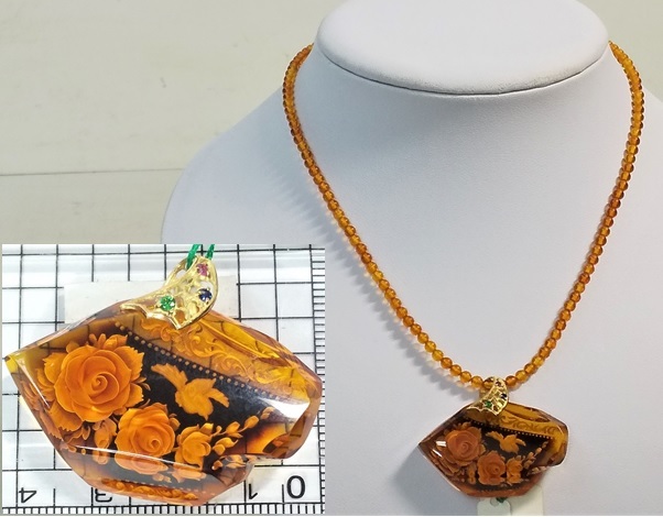> 149★最終80%OFF 琥珀 ペンダントトップ コニャック 沈み彫り K18/コニャックカラー ネックレス 丸玉1連 40cm K18★未使用