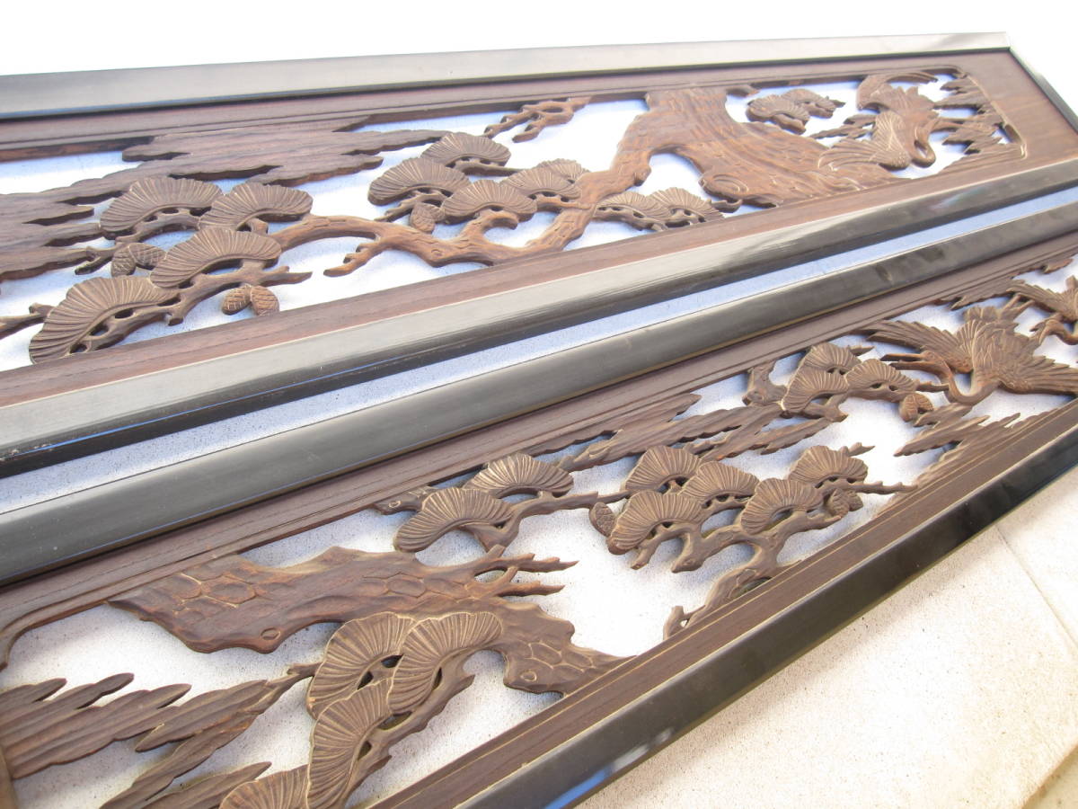 - かなり古い 欄間 鶴と松 2枚 透彫 木彫 古木彫 彫刻 一刀彫 旧家 幕末 ? 江戸時代 ? 鴨居 古建具 ※ほこり多数 破損あり 年代不詳 材質不詳
