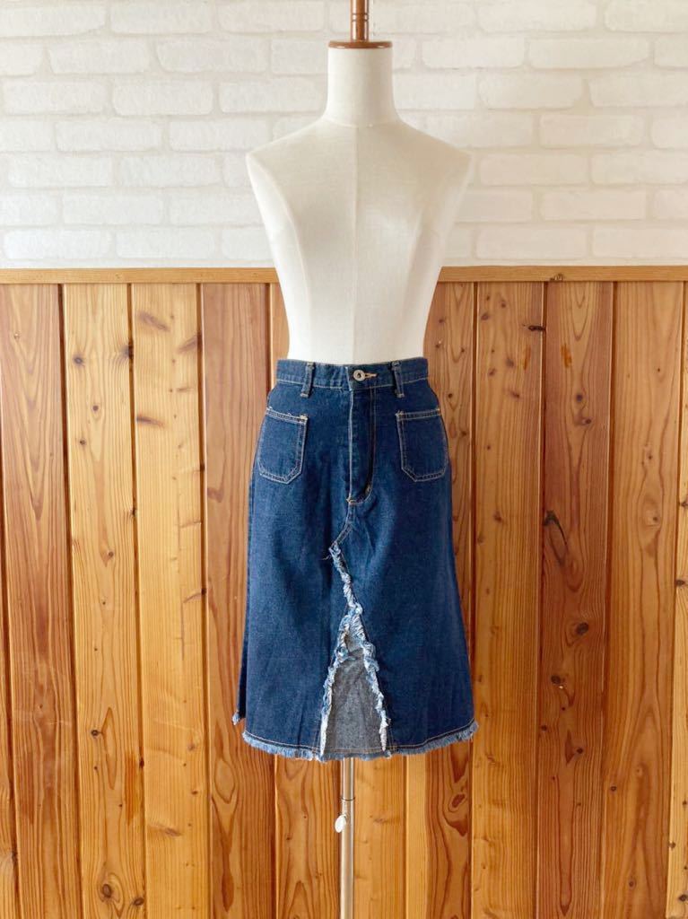 > 日本製 レディース デニムスカート Mサイズ位 エスニック ヒッピー 膝丈スカート タイト 古着 アメカジ ポケット denim skirt ⑩