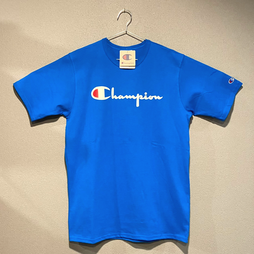- 【並行輸入品】Champion ショートスリーブTシャツ サイズS HERITAGE TEE FLOCK LOGO ヘリテージ ベロアロゴ ブルー SURF THE WEB 青 半袖