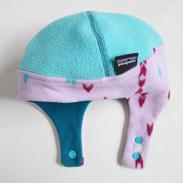 > 2017年製 ベビー 子供用 patagonia パタゴニア フリース キャップ 顎ストラップ付【6-12M】薄紫系×緑系 キッズ D142-41-0009