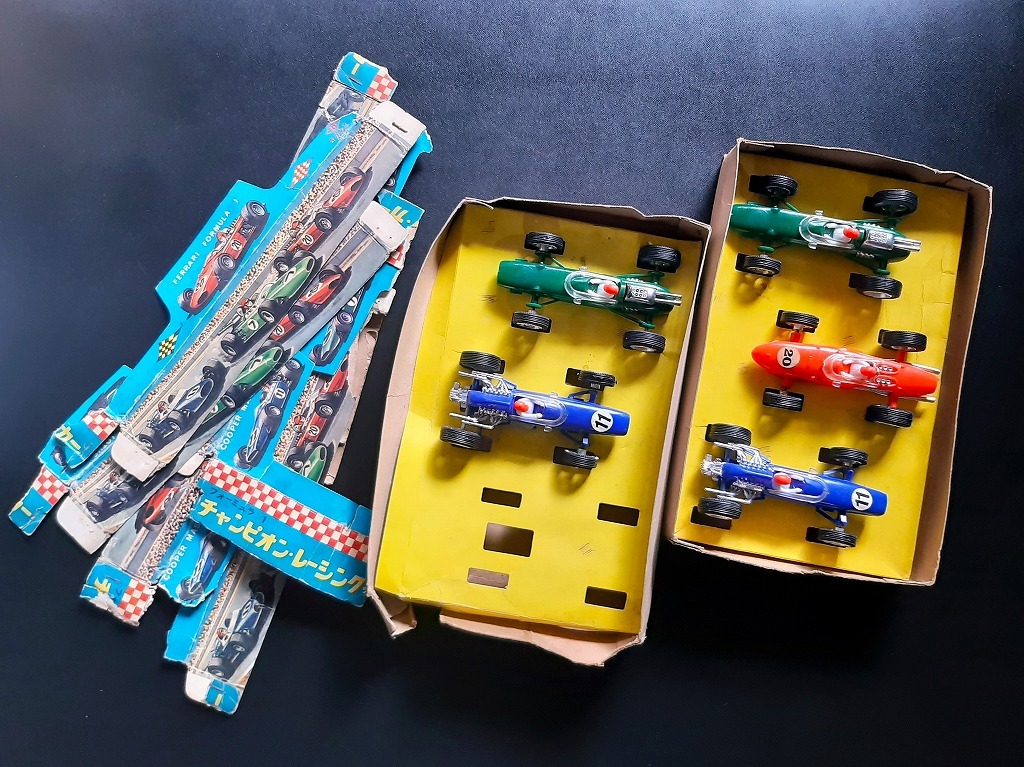 - '60s Ferrari 当時物 葉巻型 フォーミュラカー 香港製 未使用 5台セット !! ☆ LOTUS/FORD COOPER MASERATI F1 RACING ドライバー付き