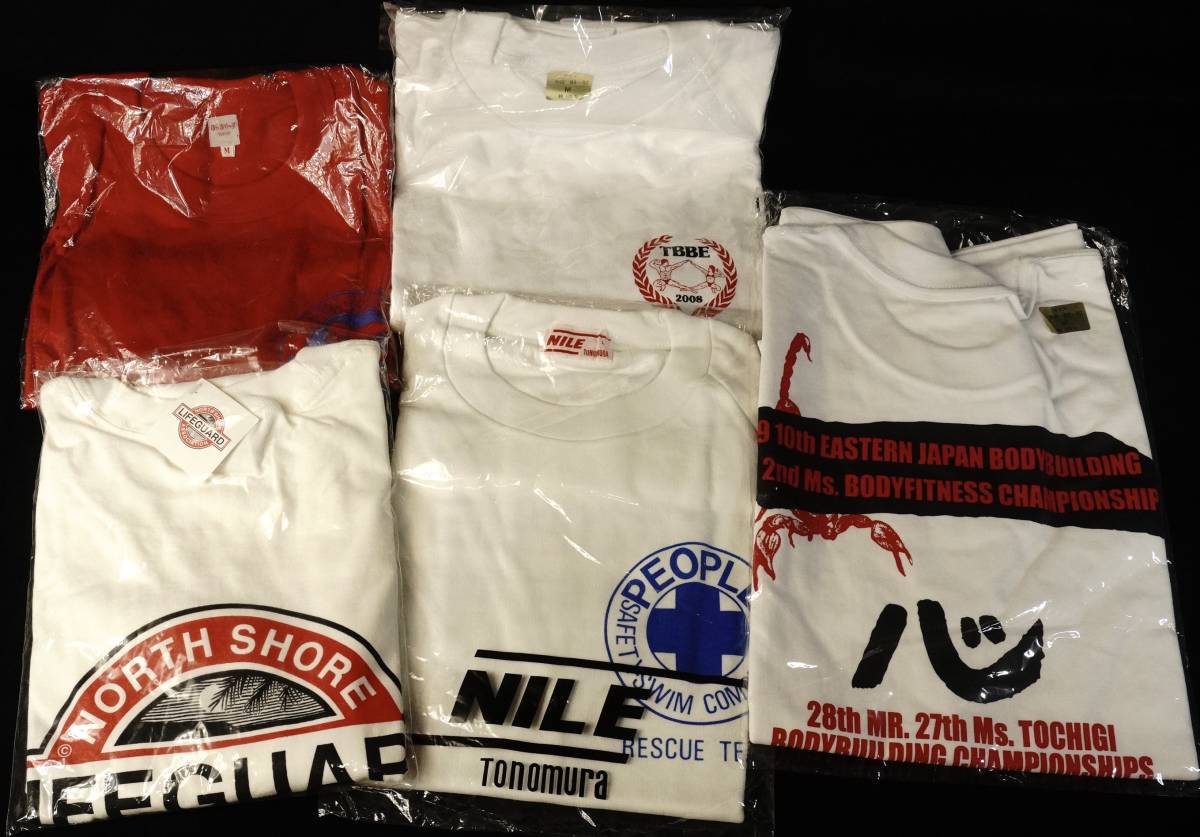 > 未使用シャツ 全5枚 ライフセーバー ライフガード レスキューTシャツ 2枚 ボディビル大会公式Tシャツ 2枚 他 未着用品 サイズ(M,M,M,L,L)