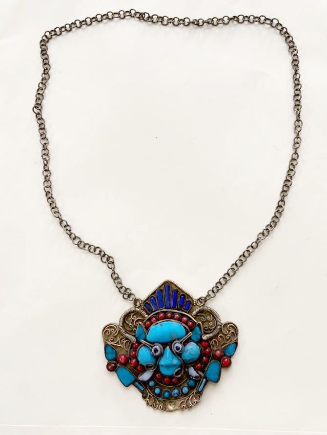 - antique☆チベット伝承 魔除守護神☆怒りの神 ペンダントネックレス☆ターコイズ原石 サンゴ ラピス