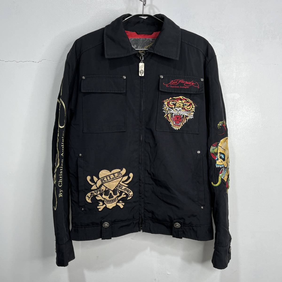 > ☆送料無料☆ED HARDY☆エドハーディー☆4つポケジップジャケット☆スカル☆タトゥー柄☆刺繍☆ワッペン☆バイカー☆黒☆S☆J22