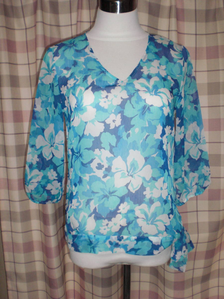 - 24)【昭和レトロ】 MK KLEIN+ 裾にリボンのあるブルー系に花柄のブラウス(USED、美品)
