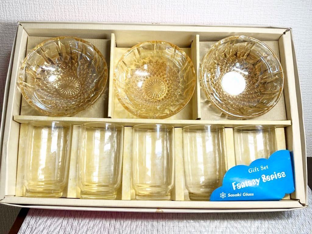- 昭和レトロ 佐々木ガラス ファンタジーシリーズ完品 サラダボウル5客、コップ5客セット 薄琥珀 飴色 アンバーカラー