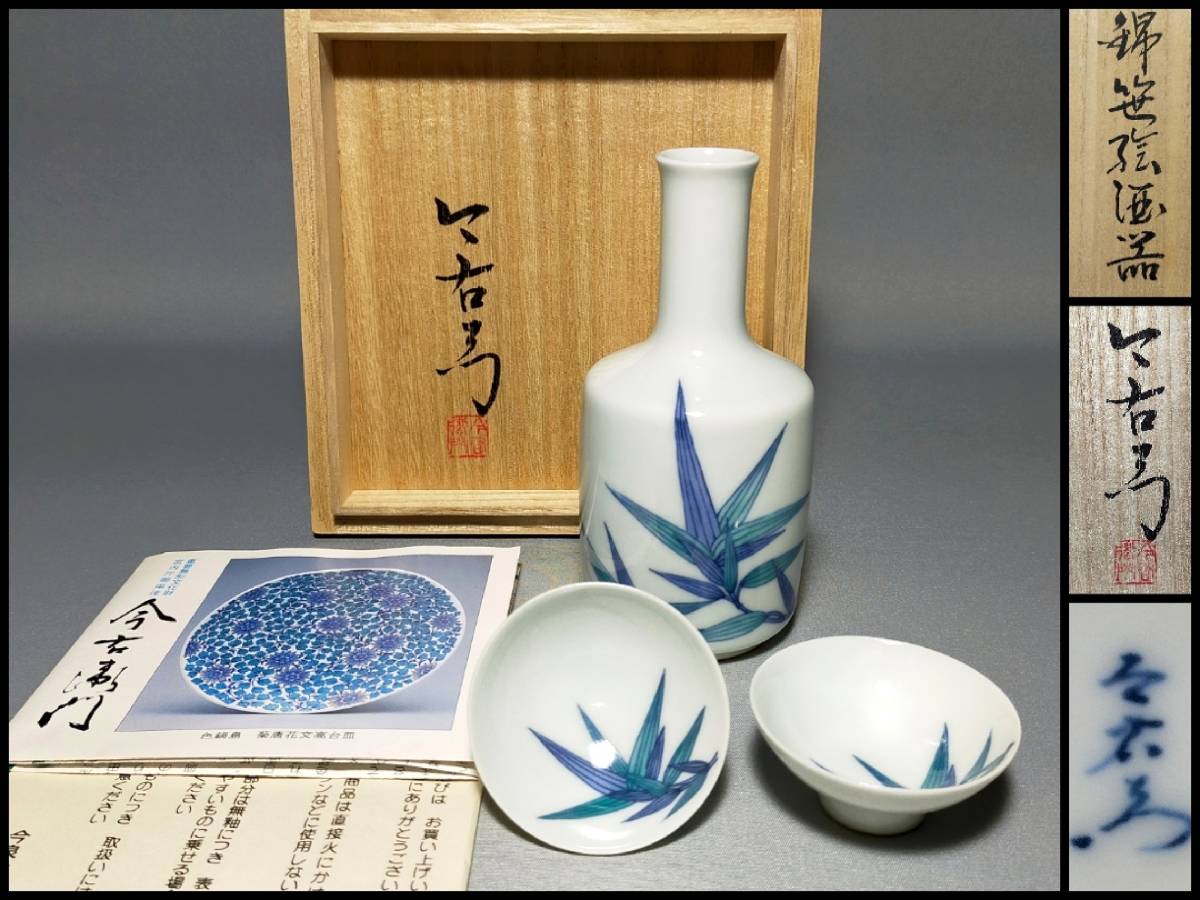 - I28 未使用 酒器 十四代 今泉今右衛門 錦笹絵酒器 徳利 盃 二客揃 栞・共箱付