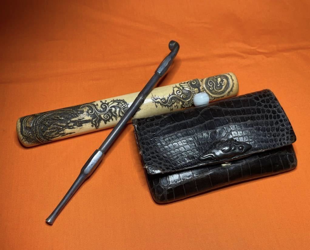 > ■時代物■ 粋な煙管入煙草入金具龍一作品!! 胴乱 喫煙具 煙草入れ 煙管 キセル入れ 革地 腰提げ 提げ物 喫煙道具 銀製 金具 当時物 古美術