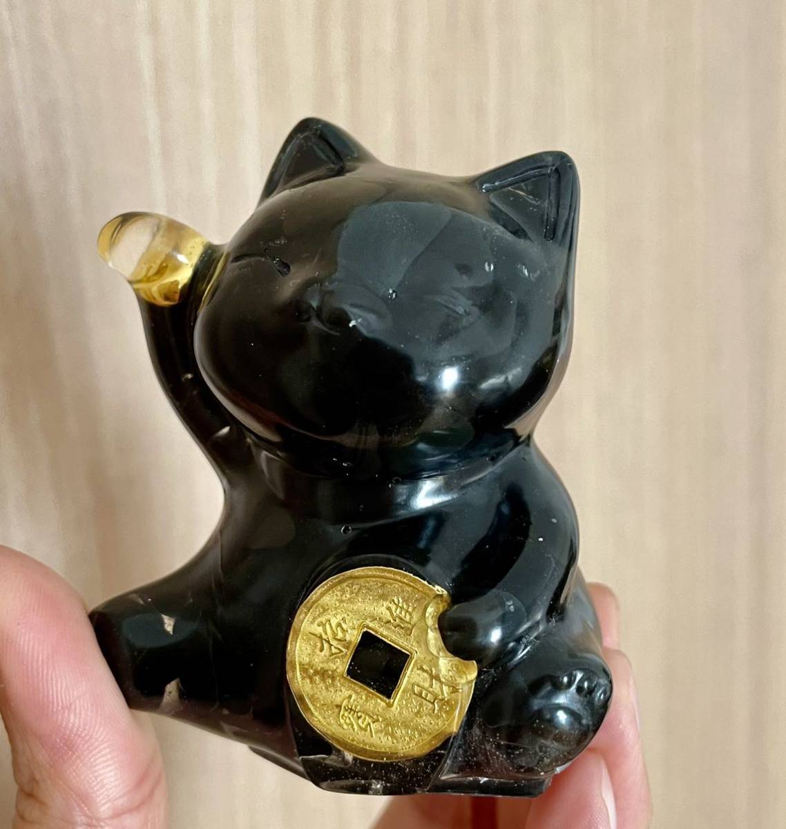 - 招き猫 オルゴナイト オブシディアン パワーストーン ラッキー 開運 幸運 置物インテリア 天然石 魔除 お守 風水晶 ブラック 雑貨グッズ
