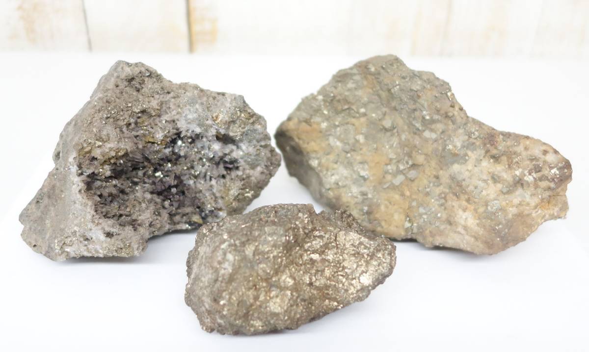 - 天然石 原石 *結晶石 三点 結晶クラスター 金属結晶石 金色結晶 *鑑賞石 飾石 景石 愛石 *重量 0.9/0.58/1.44kg