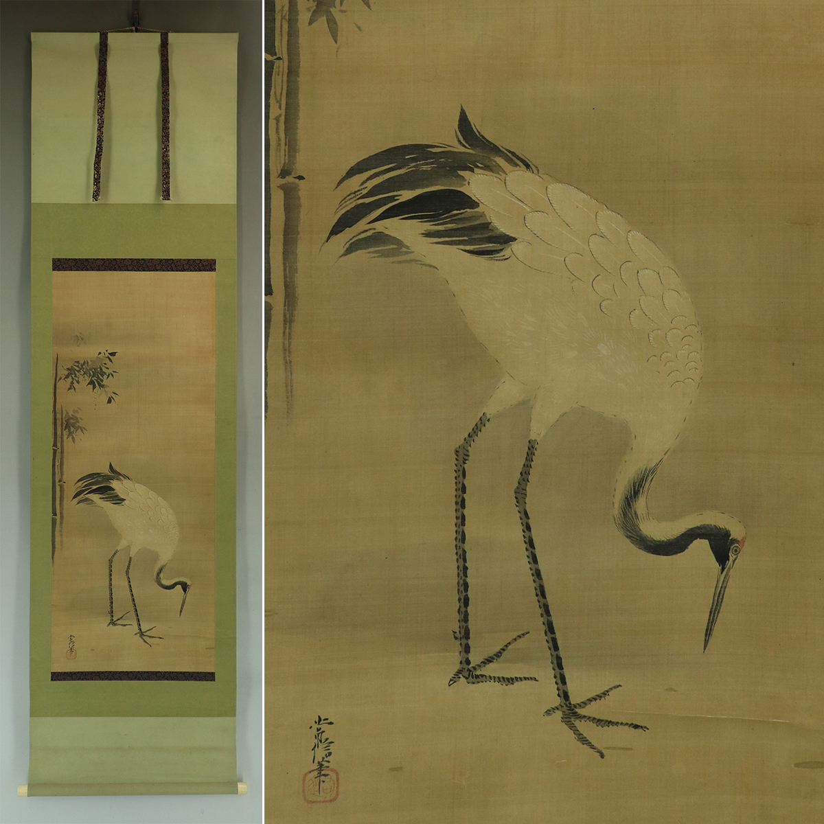 - 【真作】狩野常信【竹に鶴】◆絹本◆合箱◆掛軸 u10034
