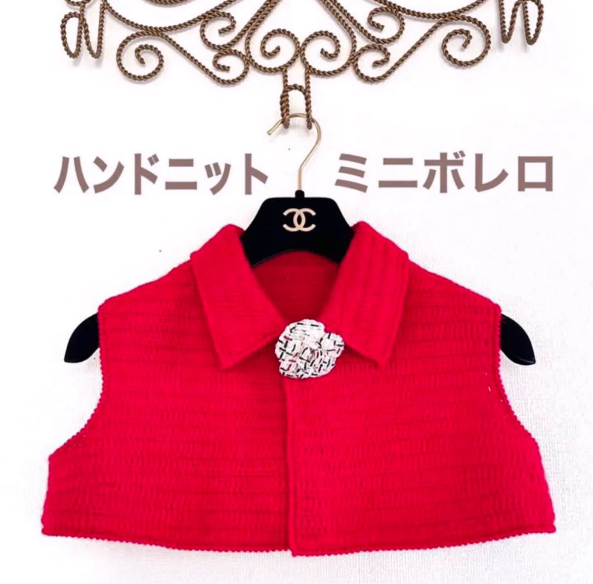 - 新品 ハンドニット 手編み ミニボレロ ショート丈 ウール 襟付き 真紅 送料無料