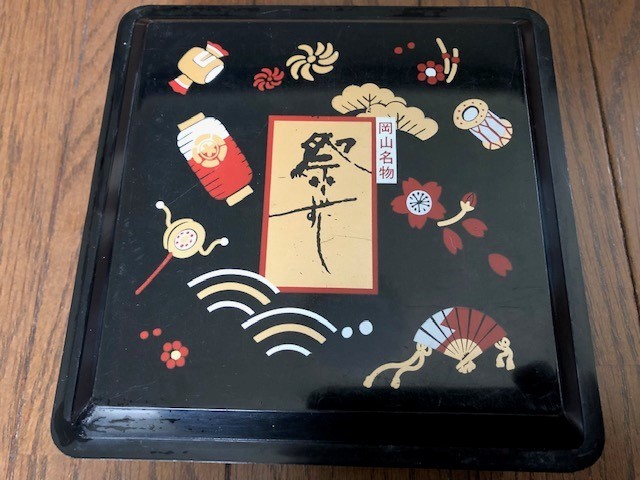 - 駅弁 弁当箱 岡山名物 祭ずし 横15cm 縦15cm 高さ5.3cm 132g 黒 桜 小槌 松 扇子 昭和 山陽本線 新幹線 送料無料 底値