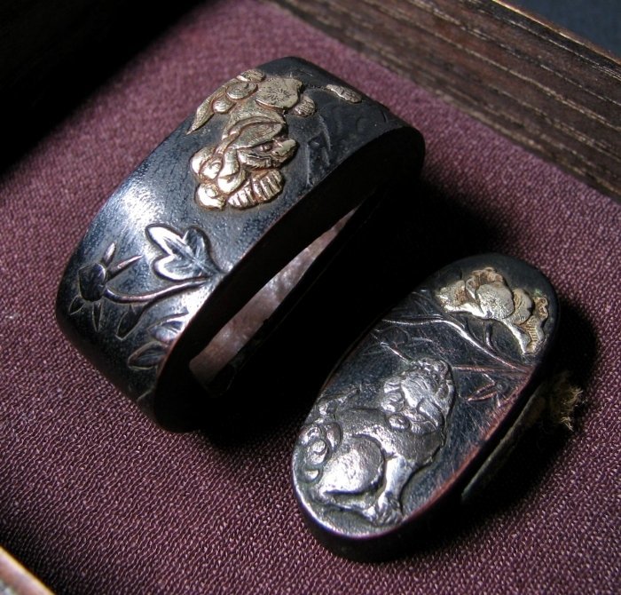 - 時代武具 赤銅地縁頭 唐獅子牡丹文 桐箱付 江戸時代/23a072