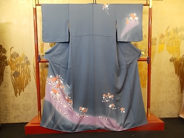 - きもの今昔4753 付け下げ訪問着 広衿袷仕立て 正絹梨地綸子地 ブルーグレー地色 しつけ付き未使用品 身丈160㎝