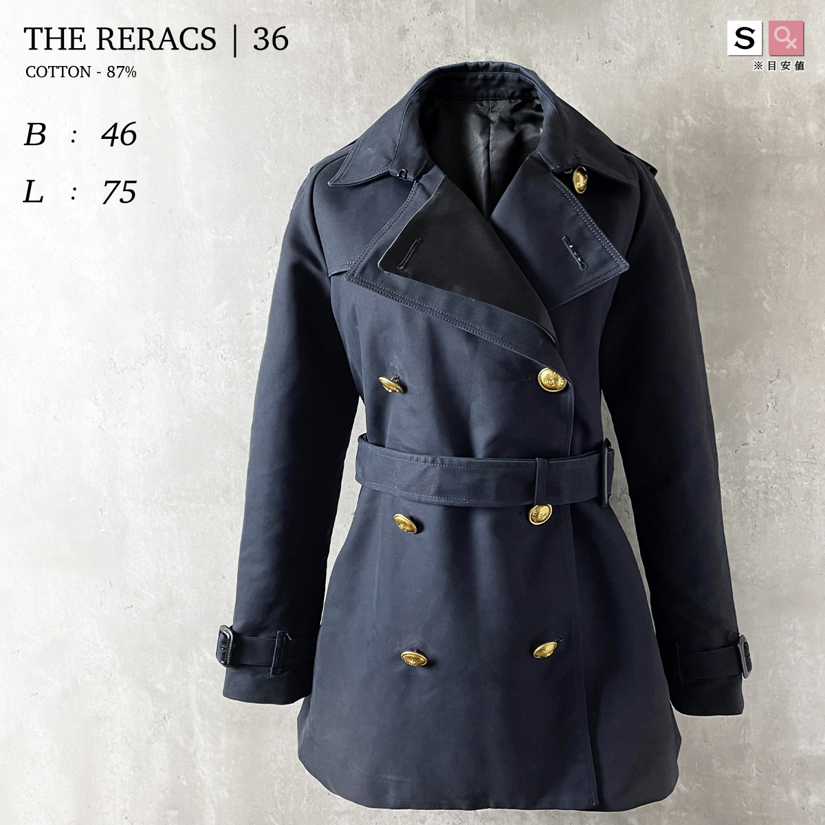 > THE RERACS ミドル丈 トレンチ コート 紺 ネイビー 金ボタン 総裏地 ラグラン 春 秋 冬 ミディ丈 ベルト 綿 ダブル ザ・リラクス 36 S 7号