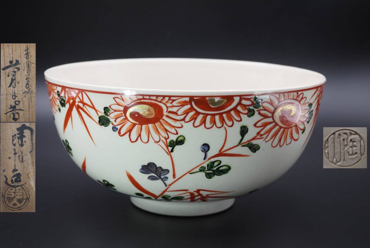 - 帝室技芸員 伊東陶山造 赤絵菊竹図 菓子器 共箱