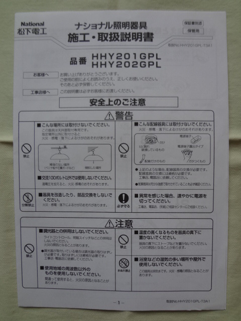 - ナショナル蛍光灯照明器具 ペンダント HHY201GPL 取扱説明書