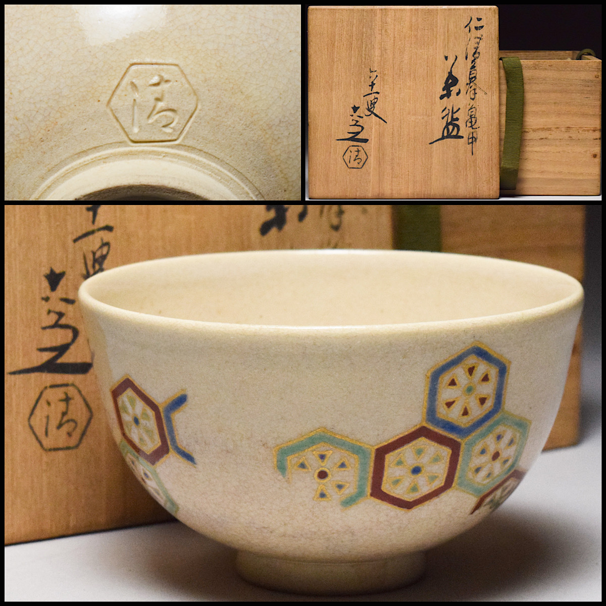 > 【八八八】五代 清水六兵衛 仁清色絵 写 亀甲茶碗 ◆共箱 茶道具 抹茶碗 【c-222】