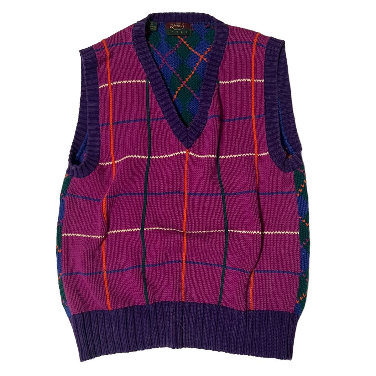 > 【1990s】ビンテージ 切り替えパターン ニットベスト Vネック 古着 総柄 オーバーサイズ パッチワーク カラフル チェック ユーロ