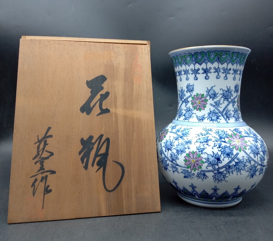 - ▽ 花瓶 / 花びん 花生 花入 花器 落款 銘有 陶器 共箱 木箱 骨董品 美術品 陶磁 陶芸 工芸品 染付 色絵 作家物 時代物 インテリア 真作