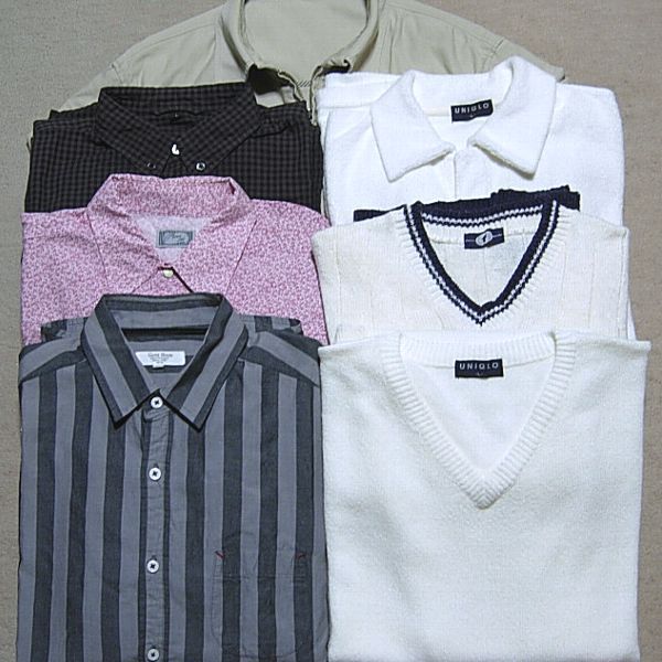 > ★ 古着メンズ秋春物トップス7着セット COXアウター/長袖シャツ/花柄/チェック/Vネックセーター/ポロシャツ/薄手ニット/ユニクロ/Lサイズ