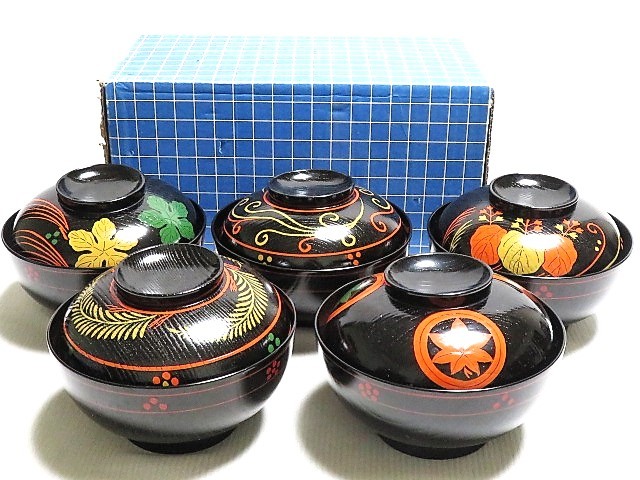 - 煮物椀5客 絵変り 五種絵 漆器 漆塗 紙箱