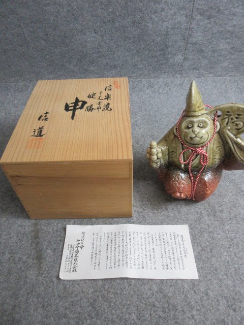 > 信楽焼 置物 [B32461] 高さ22cm 幅18.5cm 健勝申 伸道造 共箱 猿 インテリア オブジェ 古美術