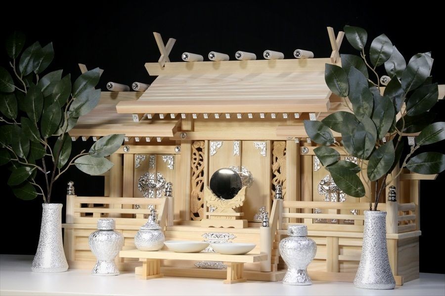 - 限定■銀風三社■鳳凰の彫刻■特大型■いぶし銀神具■神棚セット (お社本体)高さ53cm×幅80cm×奥行き31cm