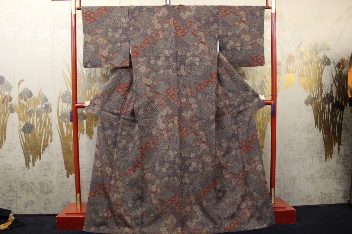 > きもの今昔4977 合繊のきもの 広衿袷仕立て 辻が花調グレー茶色小紋 使用感なく綺麗な美品 身丈168cm
