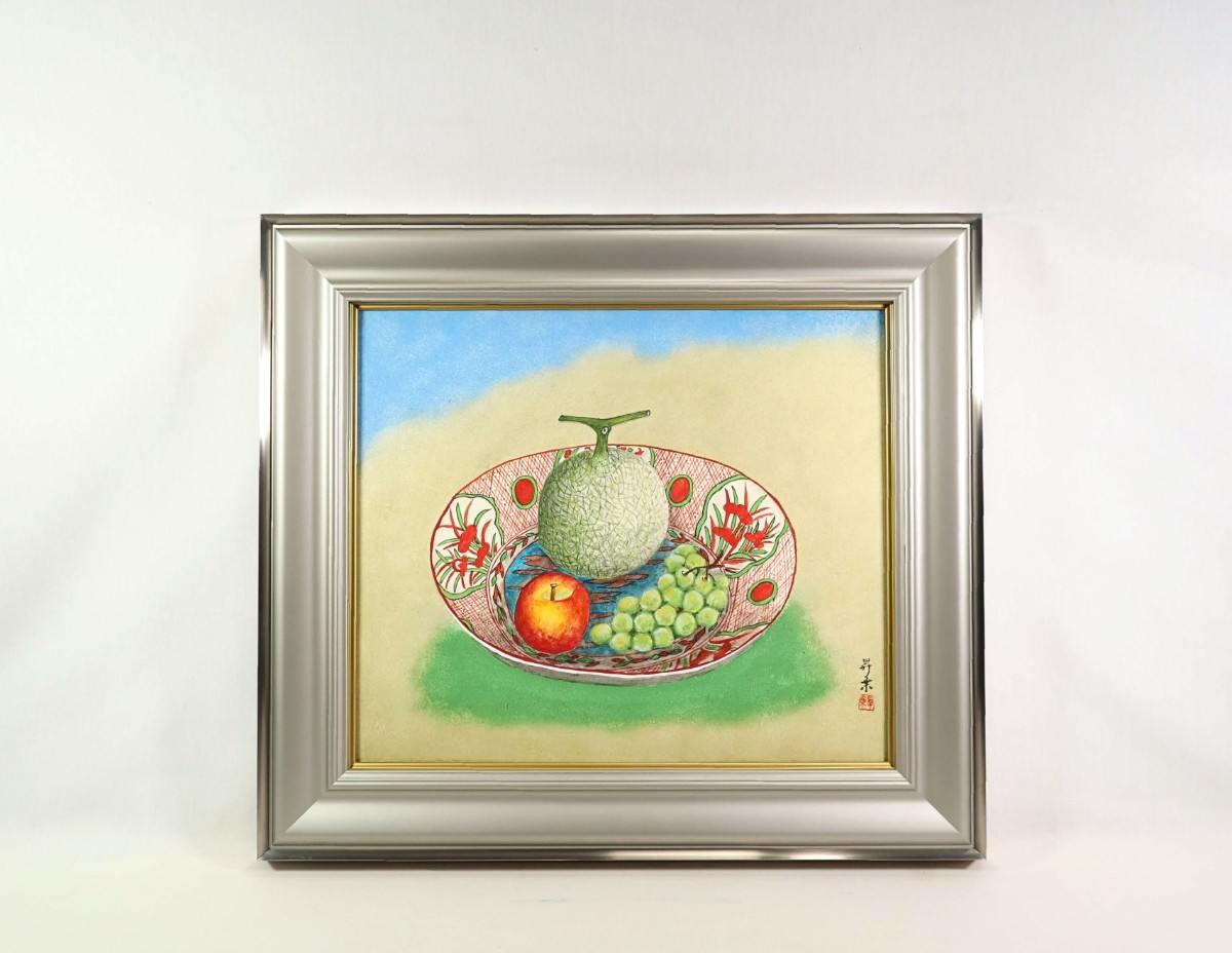 > 真作 五十川昇乗 日本画「静物」画寸 53cm×45cm 10号 岐阜県出身 日象展理事 青木大乗に師事 見事な赤絵の皿に清涼感ある果物を描く 7366