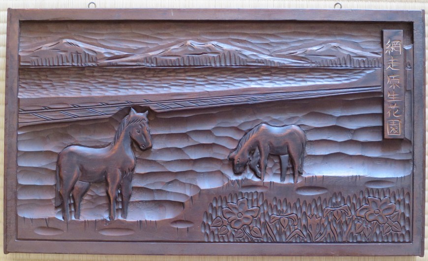 - 網走刑務所 受刑者制作 木彫り 壁飾り 壁掛け 網走原生花園 1973年購入