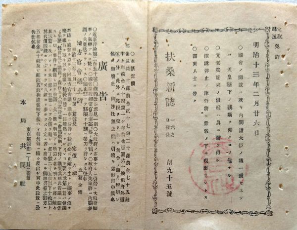 - 扶桑新誌 第95号 明治13年〇国会の開設に就き内閣諸大臣〇元老院近来の憤発〇演説停止の流行〇関東人士に告ぐ〇林 正明 9丁 2017081995