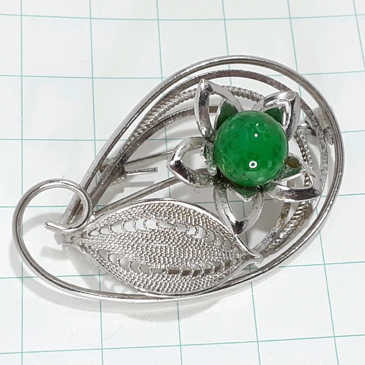 - 送料無料)ビンテージ☆七宝焼き グリーン お花モチーフ☆アンティークブローチ A16173