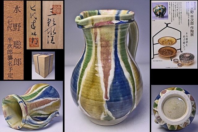 > 水野半次郎 7代 ( 水野聡一郎 ) ★ 三彩水注 ★ 共箱 栞 襲名記念展DM ★ 花を活けても映える逸品 ★ 7代 襲名展 購入作 か ★