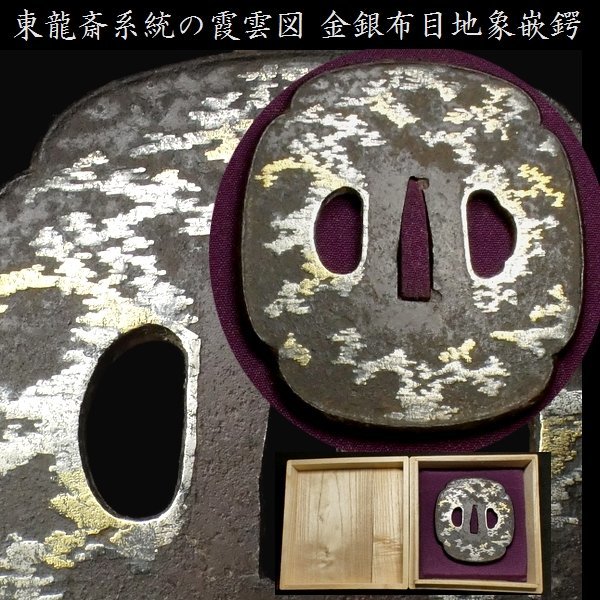 - 【 恵 #0606 】東龍斎系統の見栄え良き一品 華やかな金銀布目地象嵌 霞雲図 鉄地鍔 検:鍔/縁頭/切羽/ハバキ/刀剣/刀装具