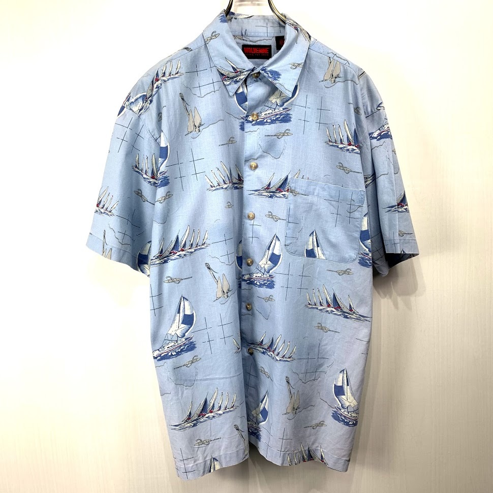 - 古着 Lサイズ 総柄 半袖 シャツ ブルー 青 帆船 ボート 縄 大きい ビッグ サイズ
