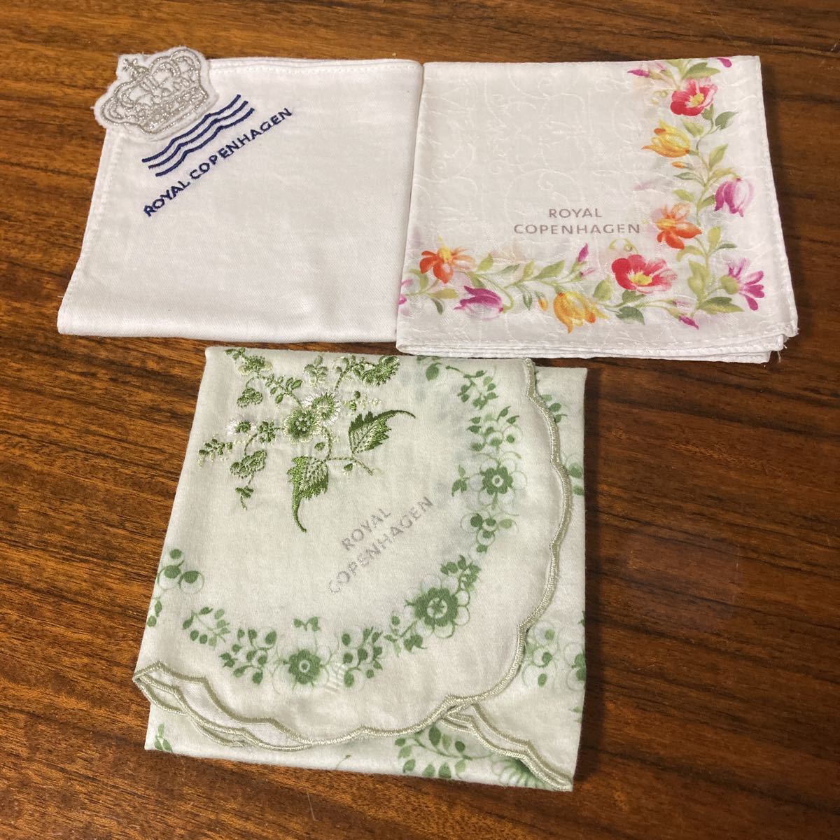 - ハンカチ ロイヤルコペンハーゲン 3枚 花柄 刺繍 王冠 白 グリーン